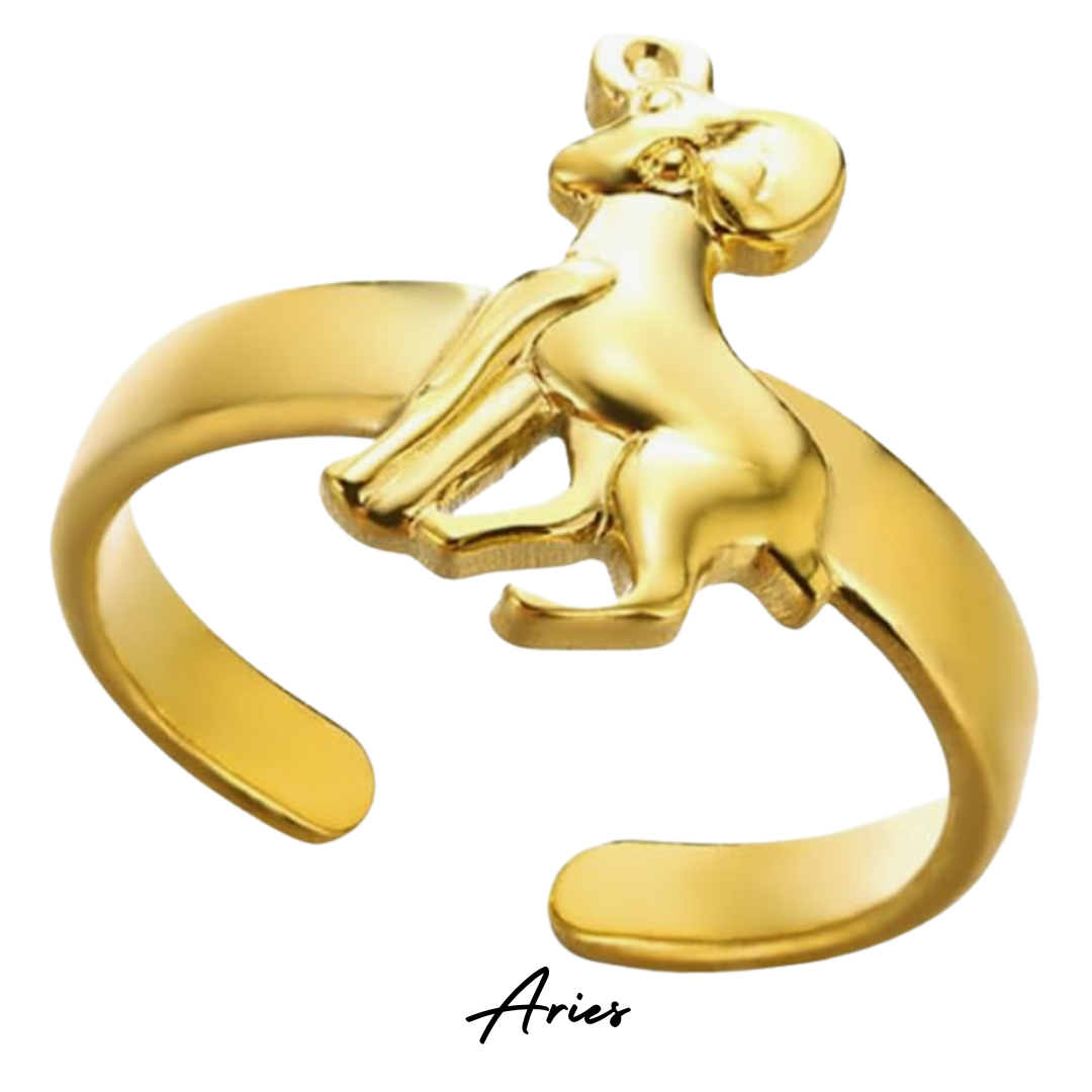 Doce anillos ajustables en Acero Inoxidable chapados en Oro de 18 kilates, creados para acompañarte siempre con la fuerza y el brillo de tu esencia zodiacal.