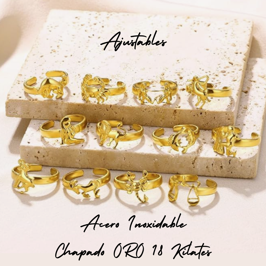 Doce anillos ajustables en Acero Inoxidable chapados en Oro de 18 kilates, creados para acompañarte siempre con la fuerza y el brillo de tu esencia zodiacal.