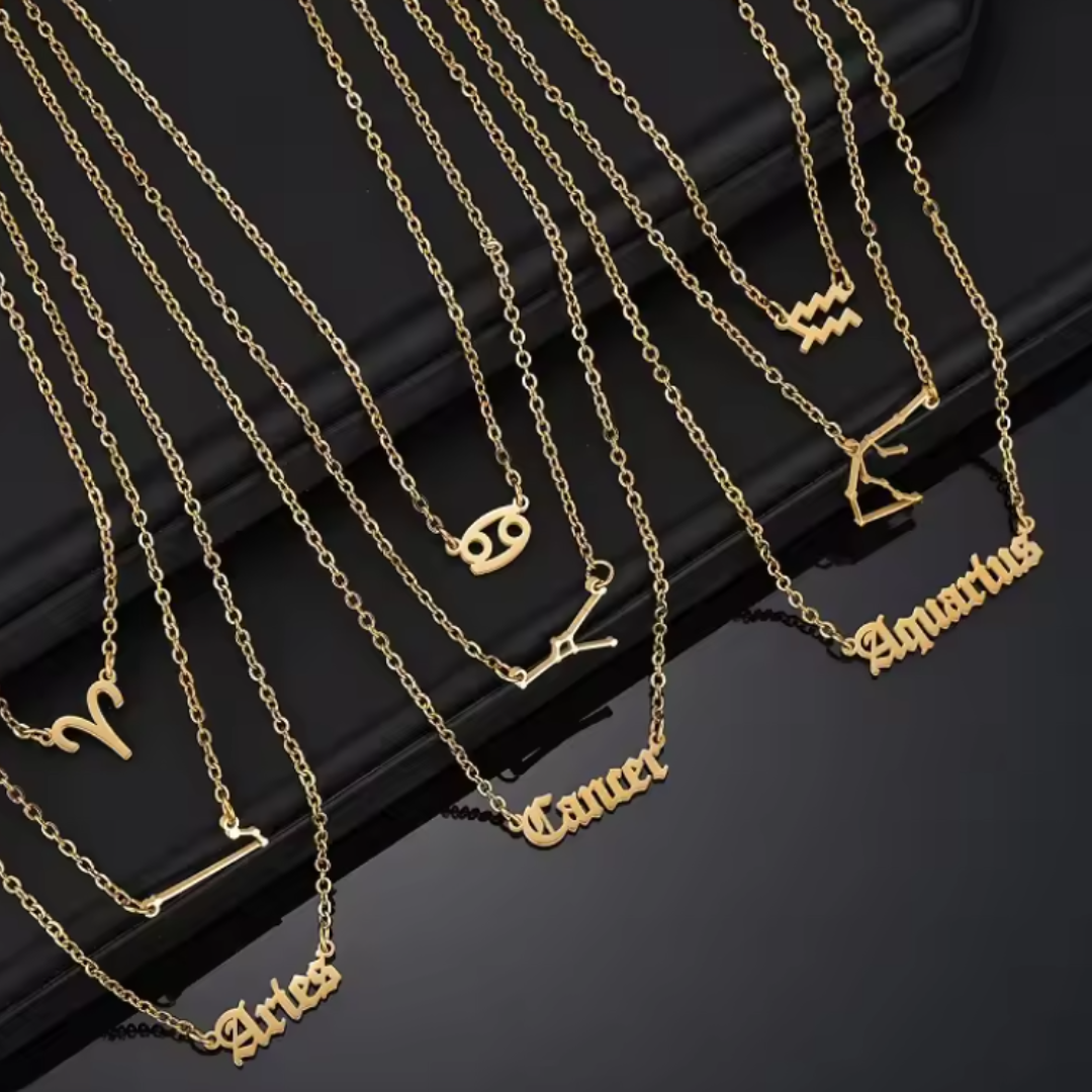 Descubre la magia de tu signo con este collar único de acero inoxidable, que combina el símbolo, la constelación y el nombre personalizable.