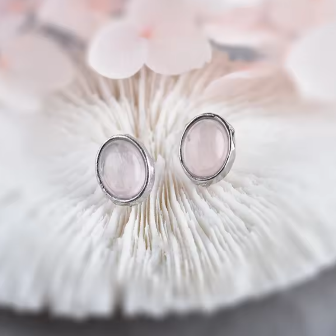 Pendientes Piedra Natural - Ovalados - Cuarzo Rosa - Plata de Ley